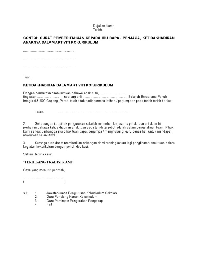 The assortment of images Contoh Surat Makluman Aktiviti Kokurikulum Kepada Ibu Bapa that are elected directly by the admin and with high res HD as well as facilitated to download images. Surat makluman program kepada ibu bapa. Rujuk Lampiran 16 25 Surat pemberitahuan kepada ibu bapapenjaga ketidakhadiran murid dalam aktiviti Kokurikulum.